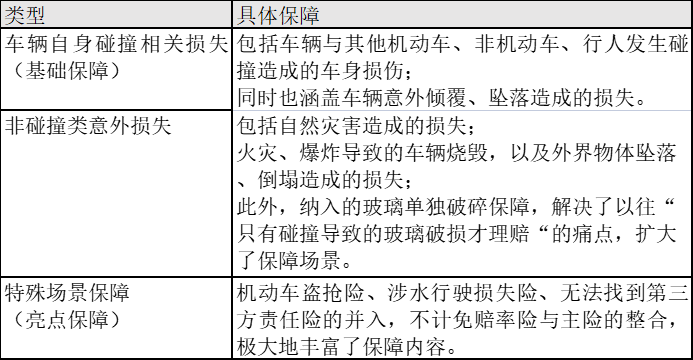 具体来看,现行车损险的核心保障可分为三大类。
